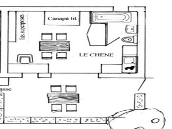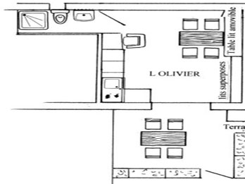 - Kitchenette: plaque électrique 2 feux, evier, four multi-fonctions, frigo/congélateur, hotte, placard