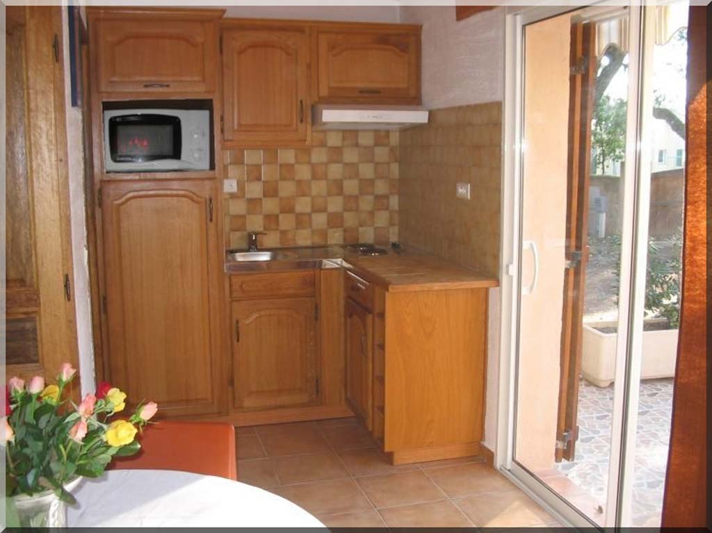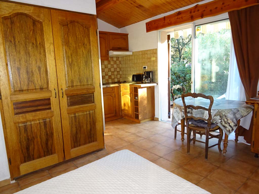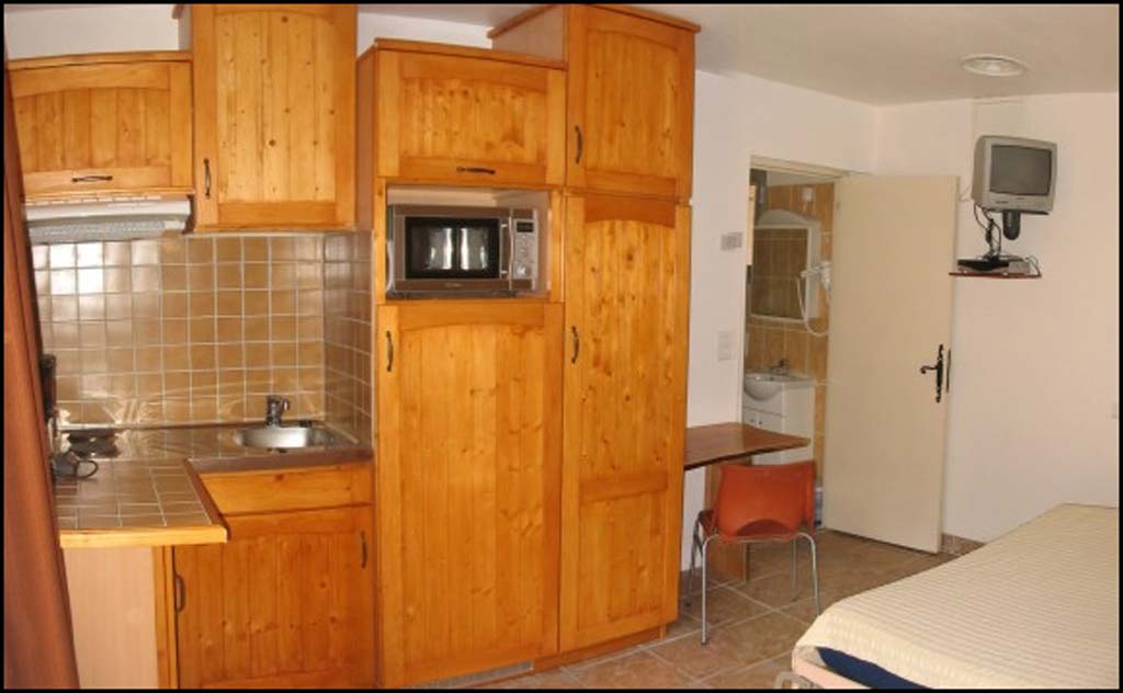 - Kitchenette: plaque électrique 2 feux, evier, four multi-fonctions, frigo/congélateur, hotte, placard